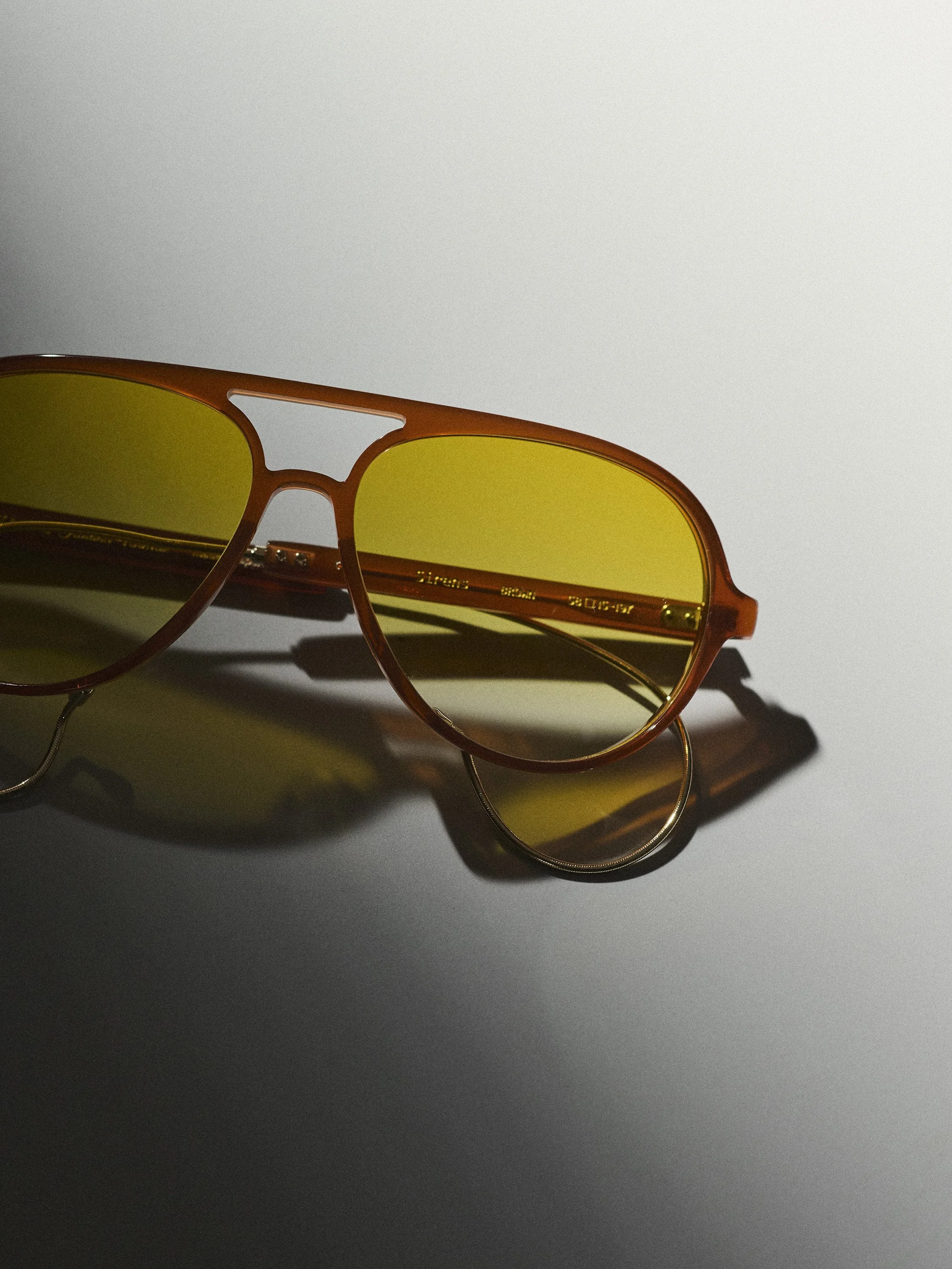 Based on a pair of 1970s vintage aviator sunglasses owned by Adrian Younge, this model fuses the distinctive cable temple details found in 1950s safety glasses.